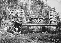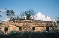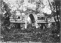 (Foto: T. Maler) Labná liegt im Herzen des nordyucatekischen Puuc-Gebiets. Seine Blütezeit fällt in die Endklassik (ca. 790 910 n. Chr.). Hier beginnt 1886 die lange Reise des Teobert Maler durch die Ruinenstädte der Maya. Tausende von Kilometern legt er zurück, zu Pferd, zu Fuß, im Kanu, per Eisenbahn und Dampfschiff. Edward Thompson, mit dem er in herzlicher Feindschaft verbunden war, schreibt dazu mit einem leisen Kopfschütteln: "Der deutsche Mr. Maler kam nach Mérida zurück und sah wie ein Gespenst aus. Man sollte meinen, wenn man ihn ansieht, dass seine Arbeit damit zuende ist, aber er hat die deutsche Dickköpfigkeit und den Mut und füllt sich mit Chinin und Arsen an in der Absicht, in der nächsten Saison eine weitere Reise zu machen"